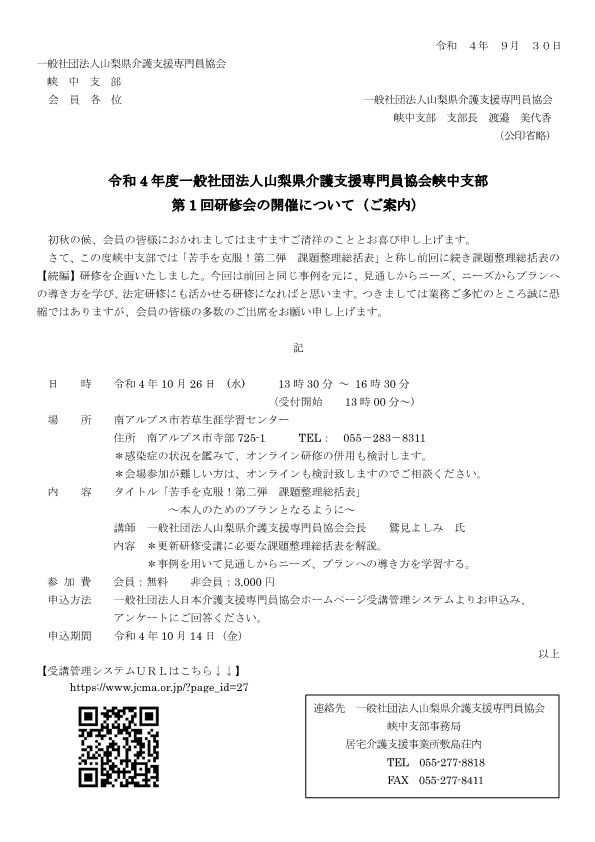 令和7年3月11日(火)南アルプス市の「若草生涯学習センター」にて、令和6年度第2回峡中支部研修会を開催します。